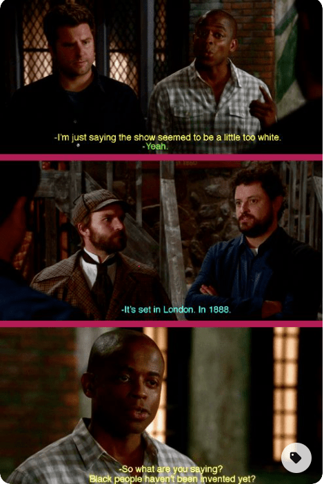 I FINALLY started watching The Mandelorian. Yes. I know. It’s about time ( – for those of you who are into Star Wars. I don’t care to those of you who aren’t. I write the facts, which means I also write the lead ins). Because I am an old, I have been watching Star Wars for a Long Time. The first one premiered when I was but a wee lass, and I loved them every since. Speaking of, y’all remember when people, who were racist, went completely apesh*t, over John Boyega being a Black Storm Trooper. Because “hOw cAN a bLaCk bE in sPaCE?”. And it always reminds me of this moment in Psych which, was one of my favorite shows: