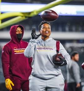 King was one of 40 women to attend the NFL’s Women’s Forum in 2018, where she met then-Carolina Panthers head coach Ron Rivera and expressed her interest in working with in the NFL. She was hired as an intern by the Panthers later that year, where she assisting in coaching their wide receivers. She got her first full-time coaching gig in 2018 as an assistant wide receivers and special teams coach for the Arizona Hotshots of the Alliance of American Football (AAF). After the AAF folded in 2019, King was once again brought on as an intern for the Panthers, this time working with the running backs. She interned once more as a coach with the Washington Football Team in 2020, working once again under Rivera who joined Washington that season. She was promoted to assistant running backs coach the following year, making her the first (only) black woman to become a full-time coach in NFL history. In 2021.